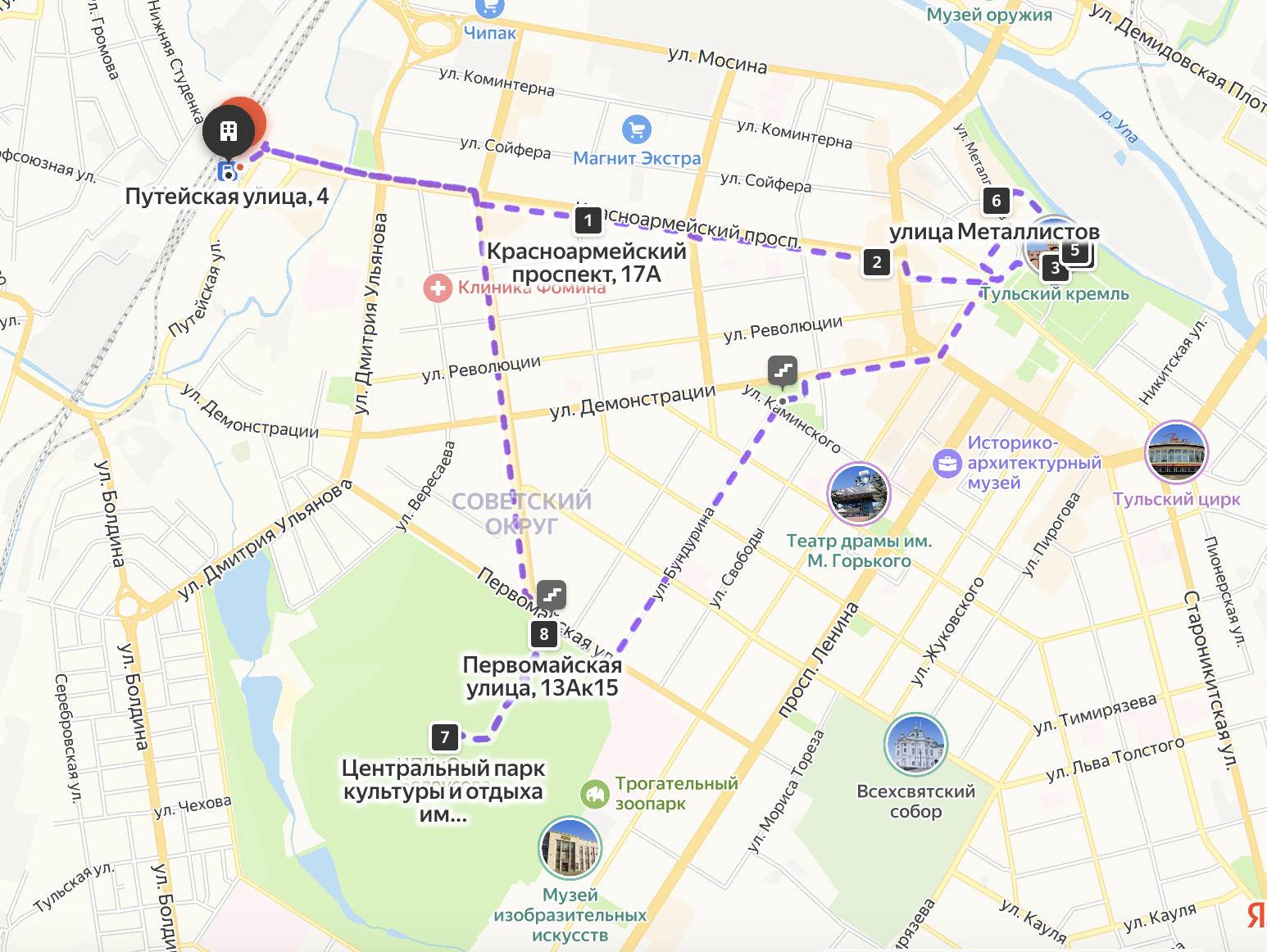 От вокзала по Красноармейскому проспекту прогуливаемся к одной из главных достопримечательностей - Тульскому Кремлю! Путь займет примерно 40 минут пешком, и 20 минут на общественном транспорте, ловим автобус 39а от вокзала до остановки «Советская улица».